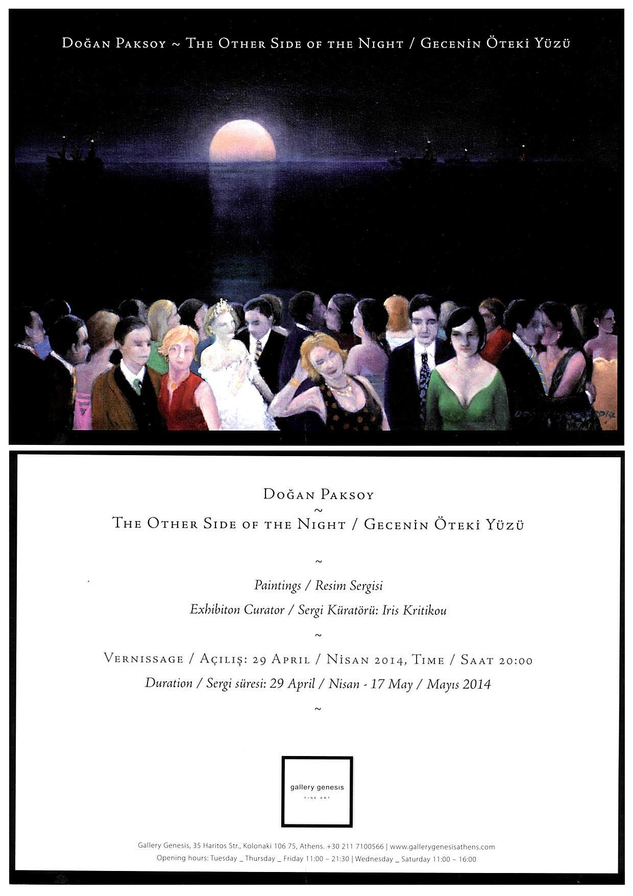 Ressam Doğan Paksoy'un "Gecenin Öteki Yüzü" isimli resim sergisi açılışı 29 Nisan 2014 tarihinde akşam saat 8:00 'de Atina'da Genesis Güzel Sanatlar Galerisinde yapılacaktır.